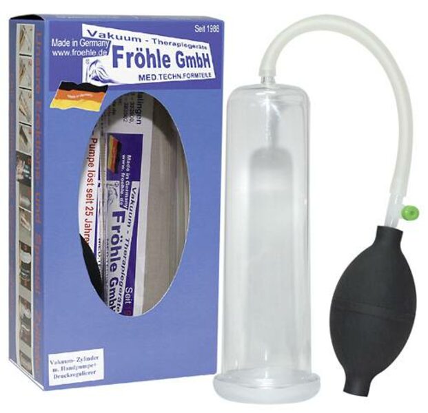 Medizinisch-technisch geprüftes Markenprodukt von "Fröhle" zur lokalen Unterdruck-Behandlung des Penis. Beim Patentamt geschützt! Komplett-Set für das gezielte Aufbau-Training des Penis. Bringt sofort mehr Steife und Stärke in den Penis! Transparenter Vakuum-Zylinder (20 cm lang, Ø 5 cm) komplett mit Steckmanschette, Handpumpe und Druckregler. Material: PVC/PP.