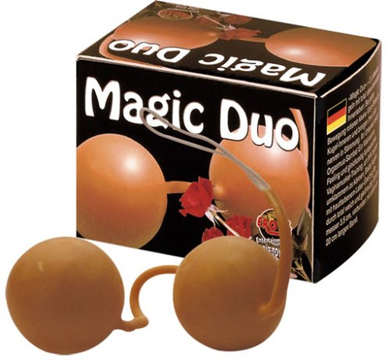 Liebeskugeln »Magic Duo«Niemand bemerkt Ihr Lustgeheimnis!Zwei hautfarbene Liebeskugeln mit Latex-Überzug an 20 cm langem, reißfestem Band. Einfach vaginal einführen und die innen rotierenden Vibro-Bälle genießen.